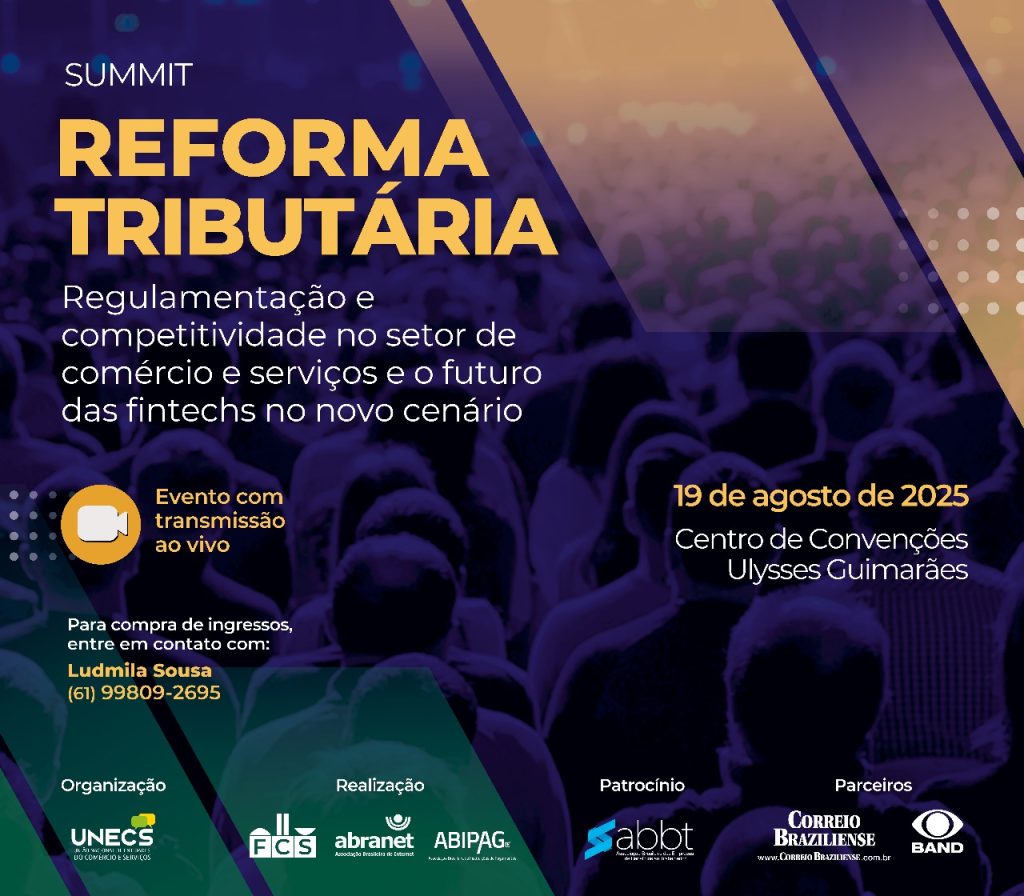 A União Nacional de Entidades do Comércio e Serviços (UNECS) é a organizadora do Summit Reforma Tributária, que será realizado em 19 de agosto de 2025, no Centro de Convenções Ulysses Guimarães, em Brasília. O evento, promovido em parceria com a Frente Parlamentar de Comércio e Serviço (FCS), Abranet e Abipag, reunirá especialistas, empresários e autoridades para debater os próximos passos da reforma.